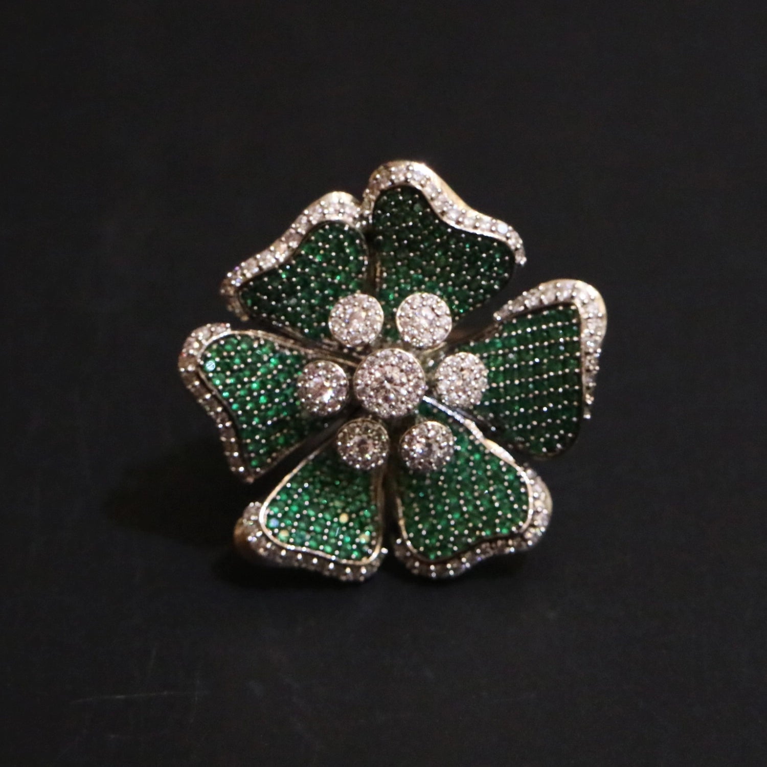 This exquisite Mint Green & White Zircon Floral Cocktail Ring is a dazzling statement piece, perfect for adding a touch of glamour to any occasion. The ring features a stunning floral design, meticulously crafted with pear-cut mint green zircons forming the outer petals, beautifully contrasted with brilliant clear zircons that adorn the center and intersperse between the green stones. The intricate arrangement creates a multi-dimensional bloom that captures and reflects light with every movement. Set in a gleaming, presumably rhodium-plated, base, this ring offers a luxurious look and feel, making it an ideal accessory for parties, celebrations, or as a sophisticated addition to your everyday elegance.